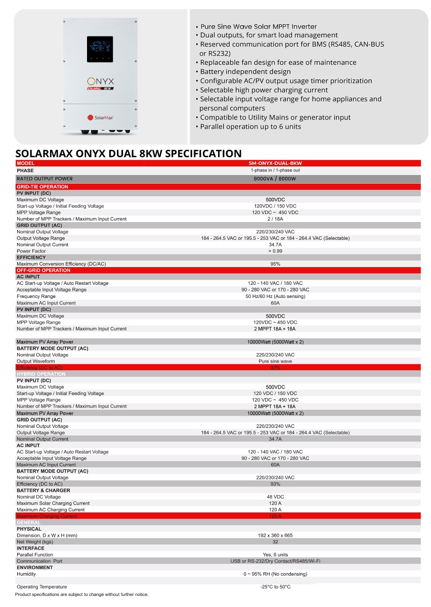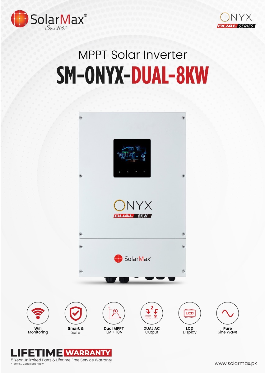 SolarMax Inverter ensure seamless power supply & reduced bills. Our Onyx Dual 8KW inverter offer unparalleled efficiency and unwavering reliability. For Domestic & Commercial industrial – we’ve got you covered! And, our after-sales service is truly unmatched!